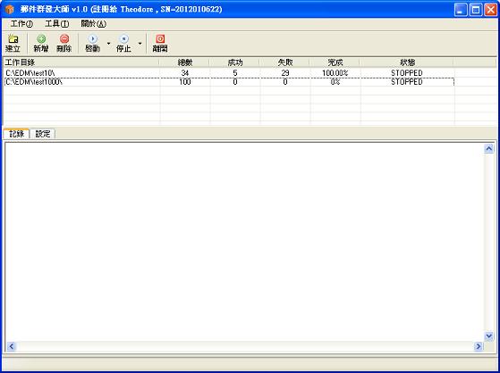 首先介紹它的主要畫面, 工能列上有[建立] [新增] [刪除] [啟動] [停止] 等功能, 新增進來的工作會顯示在列表上, 最下方是記錄畫面, 每當您點選一個工作項目, 下方記錄畫面就只會呈現該項目的記錄內容. 點選設定可以看到以下設定內容.