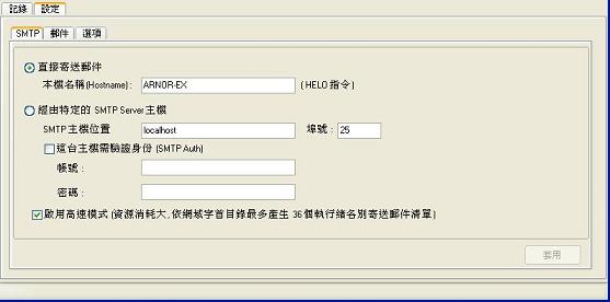 您可以選擇直接寄送或者由其它SMTP 伺服器來代寄. 這邊特別要一提得是高速模式, 此模式一啟用, 工作將依網域產生最多 36 個執行緒來同步處理您的待寄清單(網域字首 0~9 及 a~z), 此方式既效率高又同樣有著只對收方產生羽量寄信壓力的好處, 只是對系統的資源消耗也相對的高了許多.