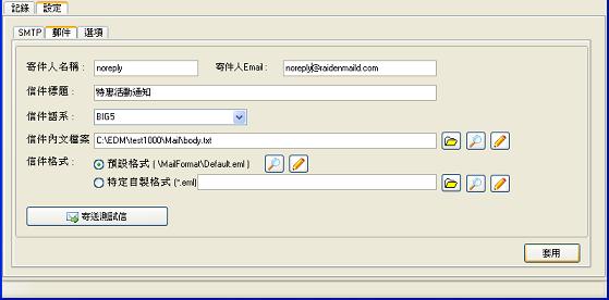 這裡要設定信件的相關資料, 包含了寄件人名稱, Email, 信件標題, 內容檔案(HTML 檔或純文字檔)及其所使用的格式檔案(*.eml).