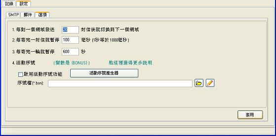 這裡可以設定附屬的時間設定, 讓您決定信件發送的間隔時間及活動序號的產生. 這邊要一提得是活動序號變數功能, 小弟認為廣告信並不一定是罪惡, 只是商業行銷的手段, 手段當然有好有壞, 但在這過程中如果讓人產生好感, 那我覺得這就會是封有效又把好處帶給他人的廣告信件, 故此功能藉由您事先產生的活動序號, 來讓您每寄一封信出去都配上一個序號, 讓您的收信人能獲得專屬活動序號, 再透過您網站的活動來取得您為客戶準備的各項專屬優惠, 雙贏的事情, 何樂而不為呢?