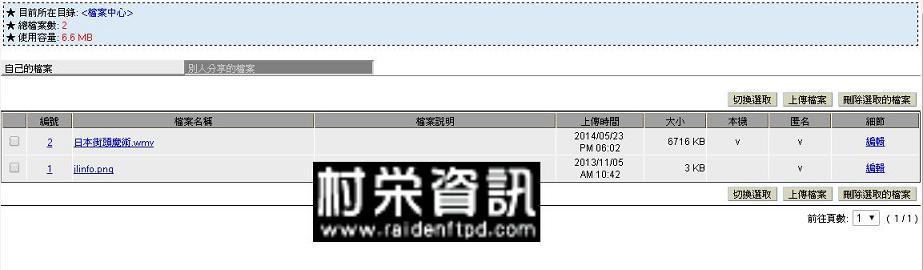 點進去後會呈現您的檔案中心檔案列表, 您可以在此上傳新的檔案或刪除檔案.