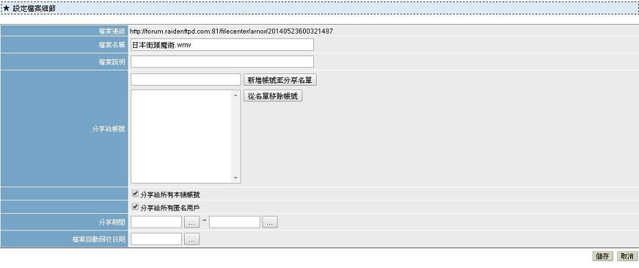 在使用者自己的檔案處, 點選編輯則可修改檔案的分享設定, 裡頭包括了檔案說明, 分享的對象, 分享的期間以及自動被系統回收的日期.