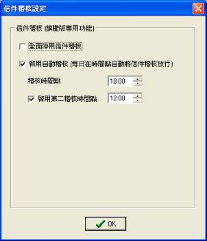故在 Webmail 的設定處, 使用者也可以設定是否啟用自動稽核, 以處理當無法手動稽核時, 改由系統每日自動放行尚存在待稽核信匣的信件.