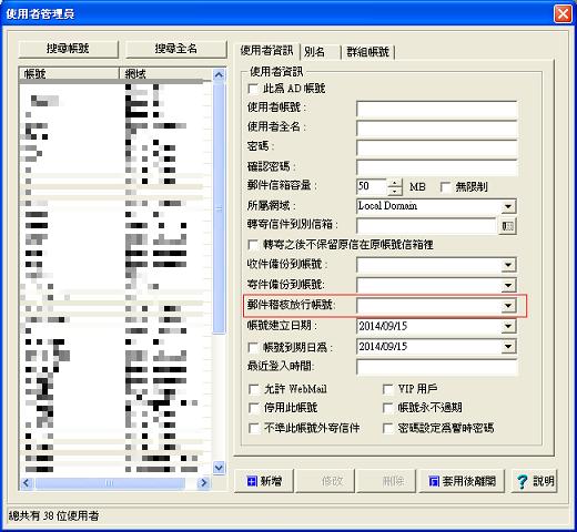 旗艦版的用戶可以在帳號管理員設定A 帳號的外寄信件需經過 B 帳號的稽核, B 帳號則透過Webmail 裡使用郵件稽核放行/拒絕放行的功能可以將此外寄信件放行或退回給原發信人.