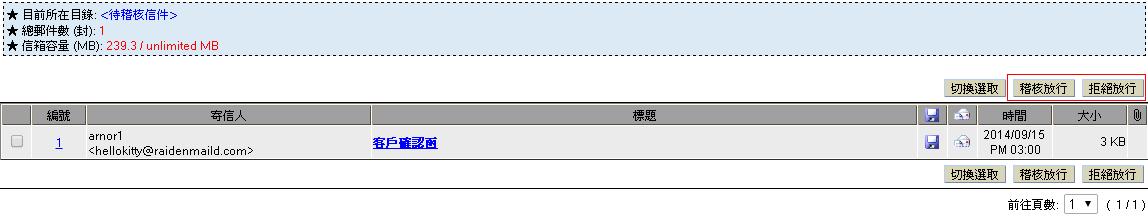 4. B 帳號可以在列表上直接進行郵件放行或拒絕的動作或點選標題閱覽信件後再進行放行或拒絕並加註意見.