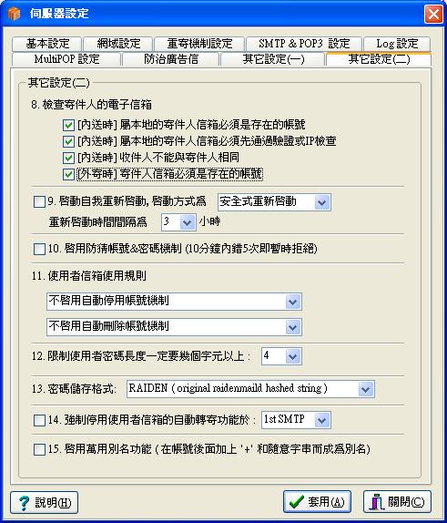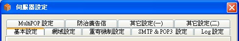 這裡有八大部份. 分別為基本設定, 網域設定, 重寄機制設定, SMTP & POP3 限制設定, LOG 設定, MultiPOP 設定, 防治廣告信設定, 其它設定.
