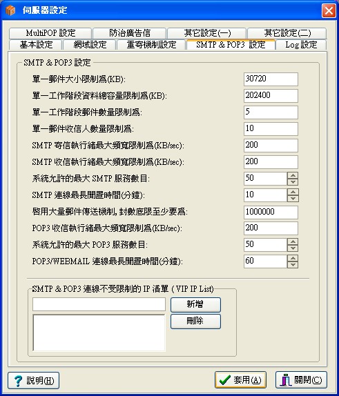 SMTP & POP3 設定意謂著使用者在使用伺服器的 SMTP 及 POP3 服務時該遵守的規定及限制.