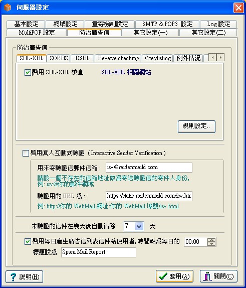 註二: 當 ReverseChecking 及 PTRChecking 都啟用時, 外界 Mail Server 寄信來時, 只要符合上述其中一項檢查就會被視為通過, 也就是兩樣檢查都不合格才會被視為廣告信.