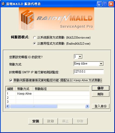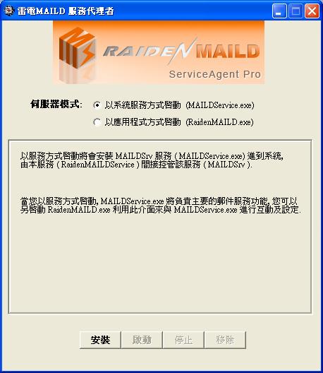 服務代理者為雷電MAILD 的代理服務程式, 負責得是啟動及監控雷電MAILD的工作. 假如您想在系統未登入時就將MAILD 啟動運作, 或利用服務來達到自我監控的功能, 就要利用此程式進行服務安裝.