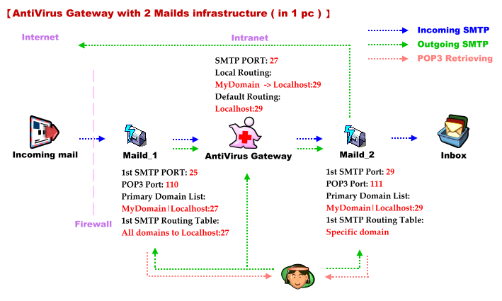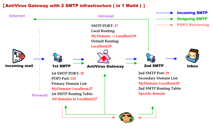 內送信件 -> 1st SMTP -> NAVGW -> 2nd SMTP -> 儲存到信箱