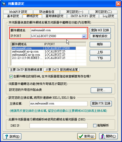 切換到 [次要 SMTP 服務網域清單] 新增或修改你的網域的 IP:PORT 為 LOCALHOST:25000 (以 2nd SMTP 為網域信件的終點站)