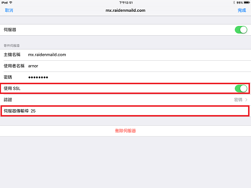 7. 上個步驟若遇到無法連線並不礙事, 因為 iOS 系統預設就是以 SSL 服務為連接的設定, 所以當它跑很久最後跳出無法連線錯誤後, 你就進到這步驟來把相對應的 SSL 選項把它們關閉就可以了.