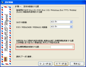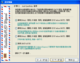 此頁面讓您設定轉寄的相關設定, 預設選項幫您啟用了智慧型轉寄 (POP before SMTP) 功能及SMTP身份驗證的功能, 此為建議選項. 按 [下一步] 繼續.
