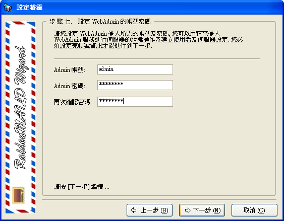設定您的遠端控制台用的管理者帳號及密碼後按 [下一步] 繼續.