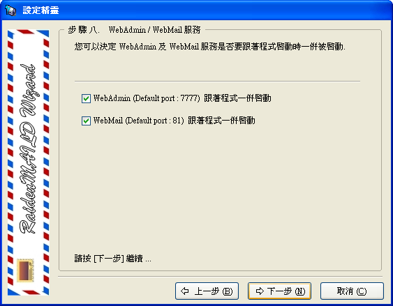設定遠端控制台及Webmail 服務啟動方式後按 [下一步] 繼續.